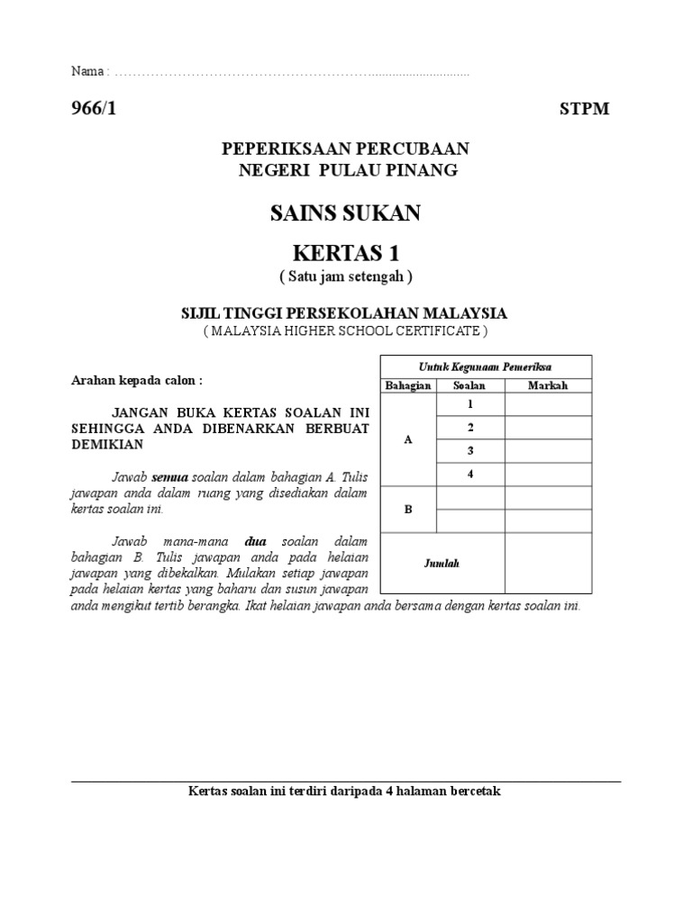 Sains Sukan Kertas 1 Stpm Peperiksaan Percubaan Negeri Pulau Pinang Pdf